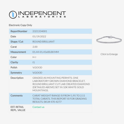 8 Reviews1 Questions & 0 Answers2704277ColorMetalTotal Carat Weight(H-I / I1) 2 CT. T.W. Lab Grown White Diamond 10K White or Yellow Gold 7.25 Inch Tennis Bracelet12345678Add to CartProduct DetailsShipping & Returns Shop the Collection(H-I / I1) 2 CT. T.W. Lab Grow...(H-I/ I1) Womens 2 CT. T.W. La...(H-I / Si2-I1) Womens 2 CT. T....Womens 2 CT. T.W. Natural Whit...(G-H / Si2-I1) Womens 2 CT. T....(G / Si2) Womens 2 CT. T.W. La...Womens 2 CT. Lab Grown White D...Womens 2 CT. Lab Grown White D...Shop The LookReviews(8)Questions & AnswersAdd To Cart