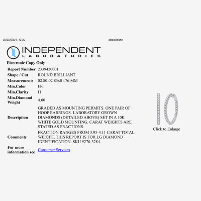 Write a Review1 Questions & 1 Answers2701259Colorproduct(H-I / I1) 4 CT. T.W. Lab Grown Diamond 10K or 14K White or Yellow Gold 34.3mm Hoop Earrings12345678Add to CartProduct DetailsShipping & Returns Shop the Collection(H-I / I1) 4 CT. T.W. Lab Grow...(H-I / I1) 1 CT. T.W. Lab Grow...Shop The LookReviews(0)Questions & AnswersAdd To Cart