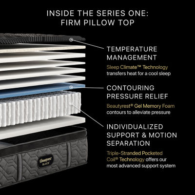 176 ReviewsAsk a Question7992719ColorSizeComfort TypeMattress Top TypeBeautyrest Black Series One 14.25" Firm Pillow Top - Mattress OnlyShop all Beautyrest Black12345678Add to CartFeaturesTemperature RegulatingWrapped Coils10 Year LimitedSpot CleanProduct DetailsShipping & Returns Shop the CollectionBeautyrest Black Series One 14...Beautyrest Black Series One 14...Beautyrest Black Series One 14...Reviews(176)Questions & AnswersAdd To Cart