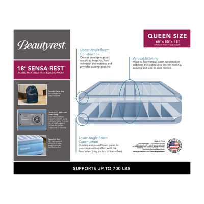 47 Reviews4 Questions & 6 Answers8010348Beautyrest Sensa Rest Queen Air MattressShop all BeautyrestModel #MM07917QN123Add to CartFeatures3 YearSpot CleanProduct DetailsShipping & Returns Reviews(47)Questions & AnswersAdd To Cart
