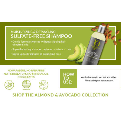 21 Reviews4 Questions & 4 Answers0650928Design Essentials Almond & Avocado Moisturizing & Detangling Sulfate-Free Shampoo 34 oz.Shop all Design Essentials12345678Add to CartHaircare AdvisorFind solutions for your hair typeFeaturesSulfate-freeParaben-freeProduct DetailsShipping & Returns Shop The LookReviews(21)Questions & AnswersAdd To Cart