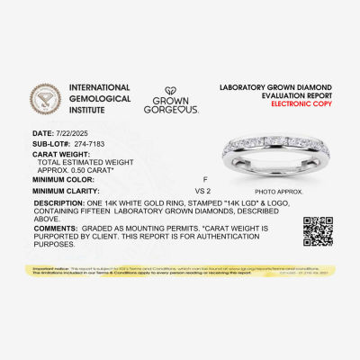Write a Review1 Questions & 0 Answers2747183ColorMetalTotal Carat WeightsizeGrown Gorgeous (F, Vs2) Womens 1/2 CT. T.W. Lab Grown White Diamond 14K Gold or Platinum Anniversary Wedding Band12345678Add to CartProduct DetailsShipping & Returns Shop The LookReviews(0)Questions & AnswersAdd To Cart