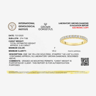 Write a ReviewAsk a Question2747185ColorMetalTotal Carat WeightsizeGrown Gorgeous (F, Vs2) Womens 1/2 CT. T.W. Lab Grown White Diamond 14K Gold or Platinum Wedding Band12345678Add to CartProduct DetailsShipping & Returns Shop The LookReviewsQuestions & AnswersAdd To Cart