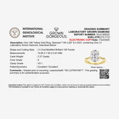 Grown Gorgeous (F, Vs2) Womens 2 1/4 CT. T.W. Lab Grown White Diamond 14K Gold or Platinum Oval Solitaire Engagement Ring