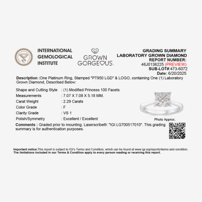 Grown Gorgeous (F, Vs2) Womens 2 1/4 CT. T.W. Lab Grown White Diamond 14K Gold or Platinum Princess-cut Solitaire Engagement Ring