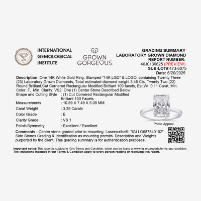 1 ReviewsAsk a Question2737122ColorMetalStone CutsizeGrown Gorgeous F, Vs2 Womens 3 1/2 CT. T.W Lab Grown White Diamond 14K Gold or Platinum Radiant-cut Engagement Ring12345678Add to CartProduct DetailsShipping & Returns Shop The LookReviews(1)Questions & AnswersAdd To Cart