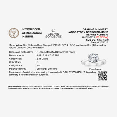 Write a ReviewAsk a Question2734034ColorMetalStone CutsizeGrown Gorgeous (F,Vs2) Womens 2 1/4 CT. T.W. Lab Grown White Diamond 14K Gold or Platinum Round Solitaire Engagement Ring12345678Add to CartProduct DetailsShipping & Returns Shop The LookReviewsQuestions & AnswersAdd To Cart