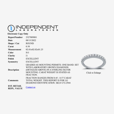 1 ReviewsAsk a Question2722944ColorsizeI Said Yes (H-I / I1) 1/2 CT. T.W. Lab Grown White Diamond Sterling Silver or 14K Gold Over Silver Wedding Band12345678Add to CartProduct DetailsShipping & Returns Shop the CollectionI Said Yes (H-I / I1) 1/2 CT. ...I Said Yes (H-I / I1) 1/4 CT. ...I Said Yes (H-I / I1) 1 CT. T....Shop The LookReviews(1)Questions & AnswersAdd To Cart