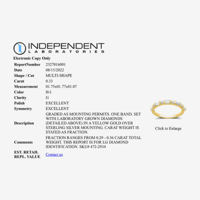 1 ReviewsAsk a Question2722934ColorproductsizeI Said Yes (H-I / I1) Womens 1/3 CT. T.W. Lab Grown White Diamond 14K Gold Over Silver Sterling Silver Wedding Band12345678Add to CartProduct DetailsShipping & Returns Shop The LookReviews(1)Questions & AnswersAdd To Cart