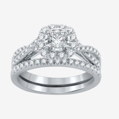 I Said Yes (H-I / I1) Womens 1 CT. T.W. Lab Grown White Diamond Sterling Silver or 14K Gold Over Silver Round Cushion Side Stone Halo Bridal Set
