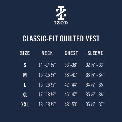 Write a ReviewAsk a Question5635371ColorsizeSize ChartIZOD Hydrashield Mens Midweight Quilted VestShop all Izod12345678Add to CartProduct DetailsSize ChartShipping & Returns IZOD Men's Tops Size GuideShop The LookReviewsQuestions & AnswersAdd To Cart
