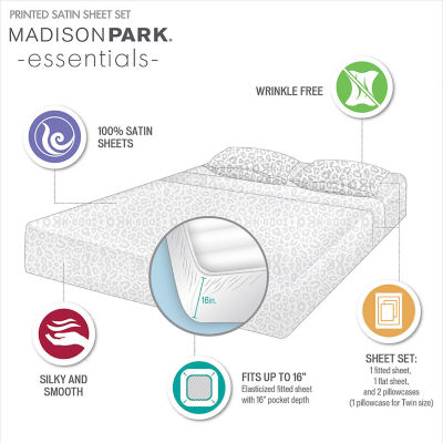 35 ReviewsAsk a Question7235892ColorproductMadison Park Essentials Printed Satin Sheet SetShop all Madison Park Essentials12345678Add to CartFeaturesWrinkle FreeMachine WashProduct DetailsSize ChartShipping & Returns Sheet Size chartReviews(35)Questions & AnswersAdd To Cart