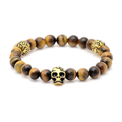 Mens Multi Color Tiger's Eye 18K Gold Stainless Steel Skull Beaded Bracelet