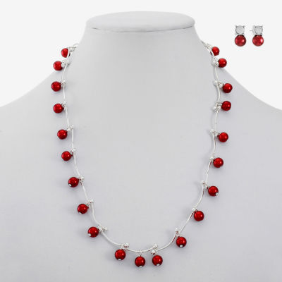 Monet Jewelry Timeless Silver Tone & Red Collar Necklace & Stud Earring Womens Glass Simulated Pearl Round 2-pc. Jewelry Set