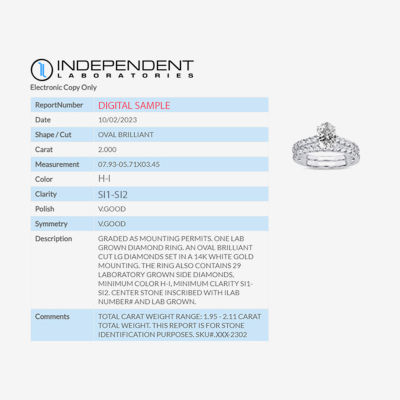 16 Reviews5 Questions & 1 Answers2732302ColorStone CutTotal Carat WeightsizeSignature By Modern Bride (H-I / Si1-Si2) Womens 2 CT. T.W. Lab Grown White Diamond 14K Gold Oval Bridal Set12345678Add to CartProduct DetailsShipping & Returns Shop the CollectionSignature By Modern Bride (H-I...Signature By Modern Bride (Si1...Signature By Modern Bride (Si1...Shop The LookReviews(16)Questions & AnswersAdd To Cart