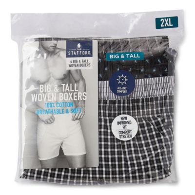 26 Reviews3 Questions & 1 Answers5040562ColorColorColorsize rangesizeSize ChartStafford Woven Mens Big and Tall 4 Pack Boxers 306207Shop all Stafford12345678Add to CartFeaturesBreathableStretch Fabric100% CottonMachine WashProduct DetailsSize ChartShipping & Returns Men's Underwear and Sleepwear Bottoms Size GuideShop The LookReviews(26)Questions & AnswersAdd To Cart