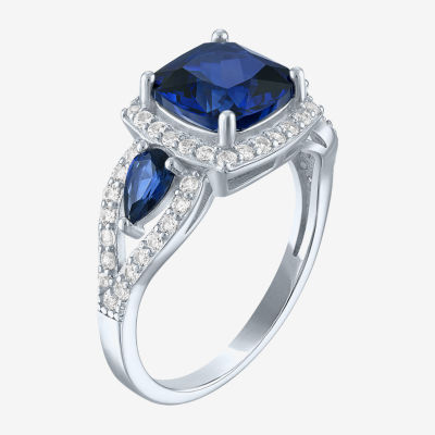Womens Lab Created Blue Sapphire Sterling Silver Halo Side Stone Cocktail Ring
